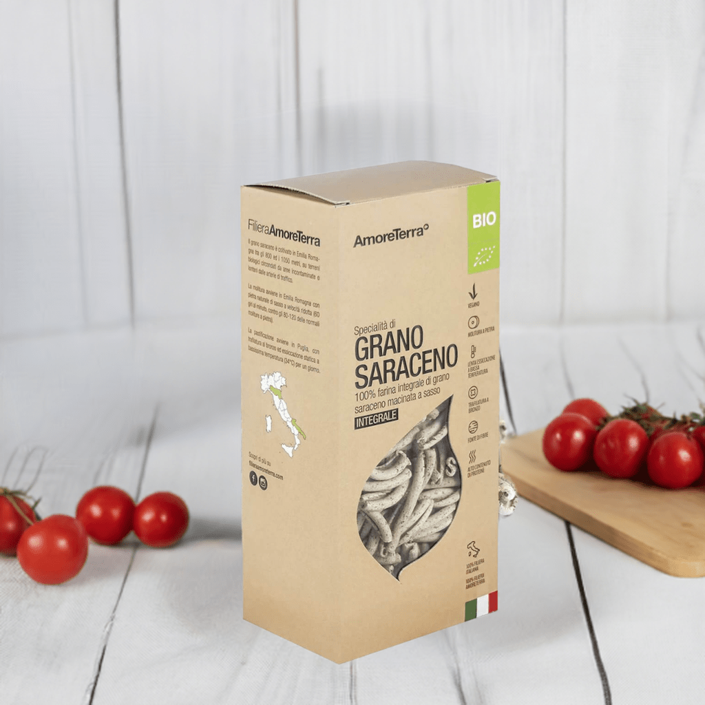 Se ami il grano saraceno prova questa pasta artigianale prodotta con solo farina integrale di grano saraceno coltivato sull'Appennino Tosco-Emiliano e macinato a pietra. Trafilata al bronzo ed essiccata per oltre un giorno a bassa temperatura (34°C). Ha un gusto carico e intenso, con note di cacao. Ideale da abbinare con pesti o condimenti di verdure. Provala anche con un trito di noci e prezzemolo.