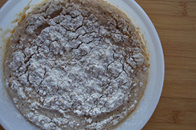 Make a pre-yeast by dissolving the brewer's yeast in the milk at room temperature. Then add the flour taken from the total, just enough to create a sort of batter. Sprinkle the surface of the batter with a light dusting of more flour and cover with cling film. Leave to rise indoors until cracks form from which you can see the surface of the yeast underneath (1) .