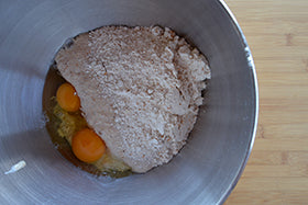 Place the pre-yeast in the mixer with the eggs and some of the remaining flour (2) .