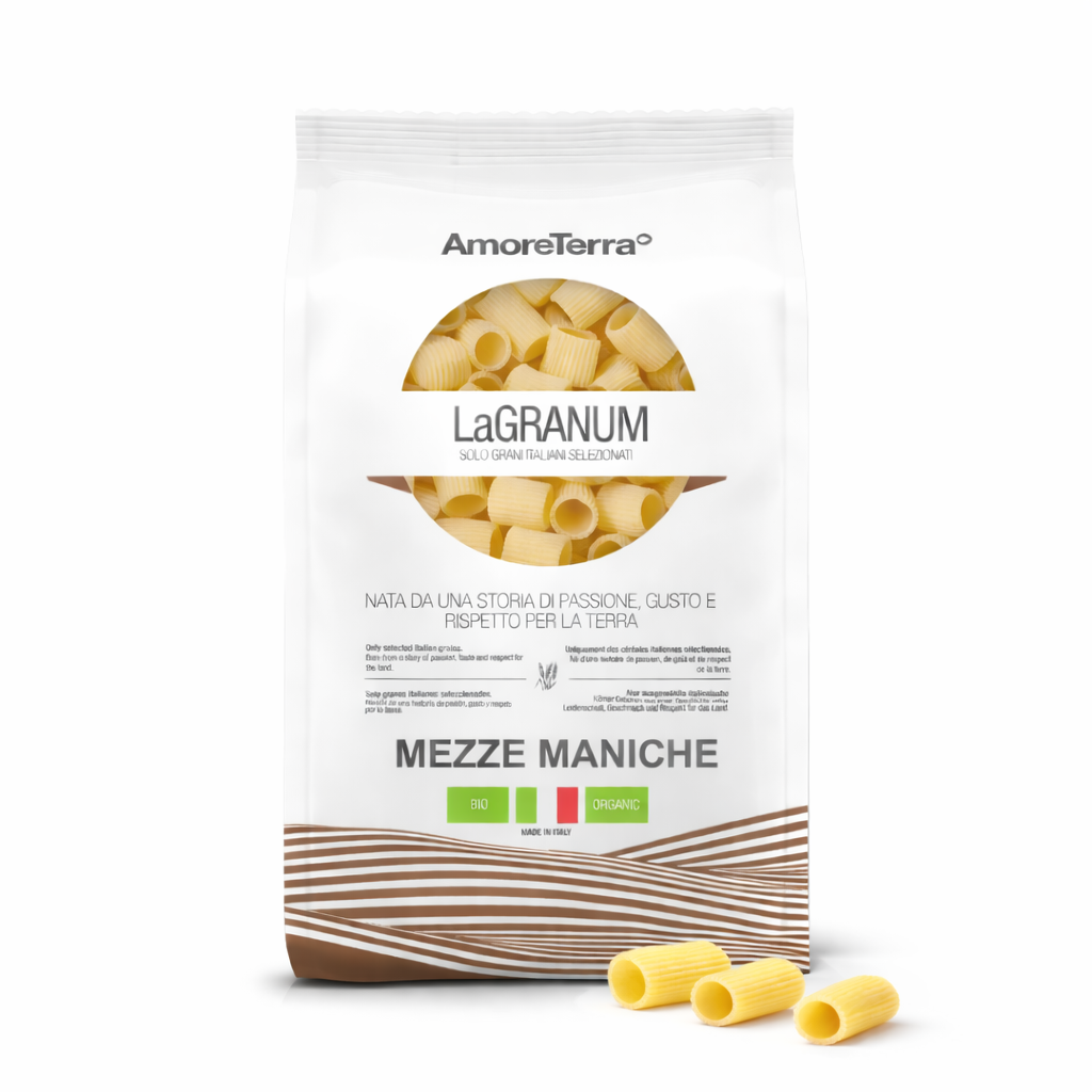 Préparé avec de la semoule de blé dur sélectionnée avec une valeur élevée en protéines de 13%, grâce à notre art de la fabrication de pâtes, nos pâtes biologiques prennent vie "LaGranum" traditionnel.